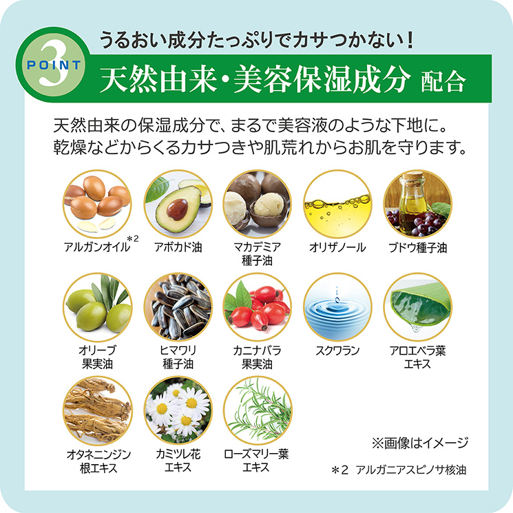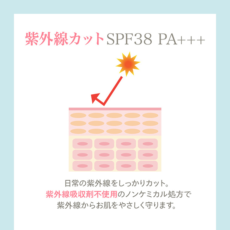 | 素材 | 水、スクワラン、プロパンジオール、ステアリン酸、ラウリン酸ポリグリセリル-10、(HDI/トリメチロールヘキシルラクトン)クロスポリマー、ステアリン酸グリセリル、 セスキイソステアリン酸ソルビタン、ステアリン酸亜鉛、リン酸アスコルビルMg、ジパルミチン酸アスコルビル、アルガニアスピノサ核油、オリーブ果実油、オリザノール、アボカド油、カニナバラ果実油、ブドウ種子油、 マカデミア種子油、ヒマワリ種子油、グリチルリチン酸2K、PCA-Na、トコフェロール、水添ヤシ油、ローズマリー葉エキス、カミツレ花エキス、マグワ根皮エキス、オタネニンジン根エキス、アロエベラ葉エキス、 ベントナイト、ジメチロールプロピオン酸ヘキシル、フェノキシエタノール、ベヘニルアルコール、ステアロイルグルタミン酸Na、キサンタンガム、ラウロイルグルタミン酸ジ(フィトステリル/オクチルドデシル)、 マカデミアナッツ脂肪酸フィトステリル、シリカ、BG、(+/-)酸化チタン、マイカ、タルク、酸化鉄、水酸化Al |