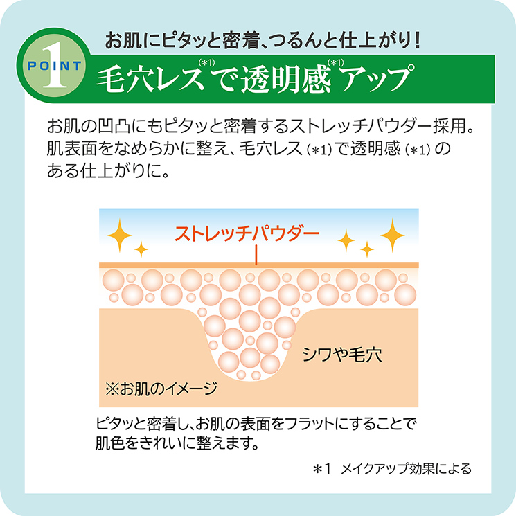 ストレッチパウダーがピタッと密着し、お肌の凹凸を整え、毛穴レスのうるすべお肌に。